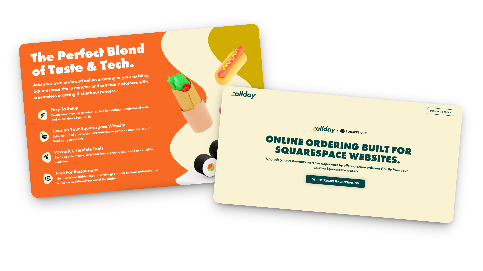 Adding restaurant online ordering to your Squarespace site doesn’t have to be complicated or expensive. With Allday, you can keep your website, your brand, and your customer relationships intact - all while giving your diners a smoother, more personal way to order.