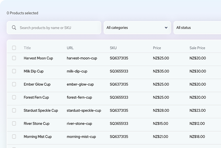Advanced Product Manager is a plugin that gives you a spreadsheet-style view of all your Squarespace products. You can see everything in one, clean table and make changes instantly. No more clicking through products one by one every time you need to make a price increase.