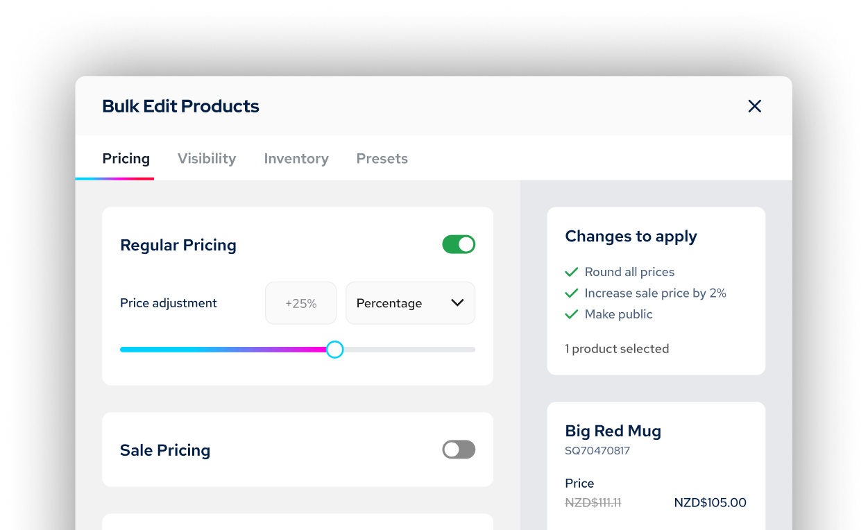 Price changes: Adjust regular prices by percentage, dollar amount, or set a fixed price across multiple products. For sale prices, you can adjust based on the regular price (say, 25% off) or modify existing sale prices by percentage, dollar amount, or fixed price.